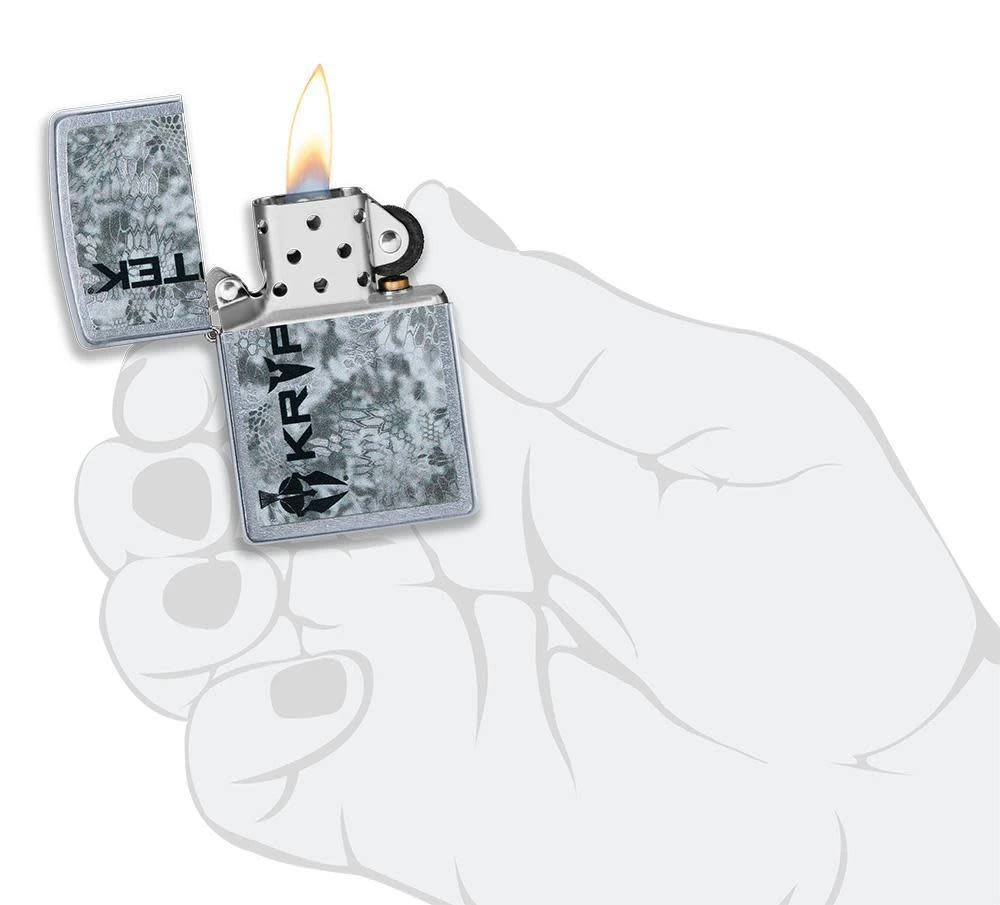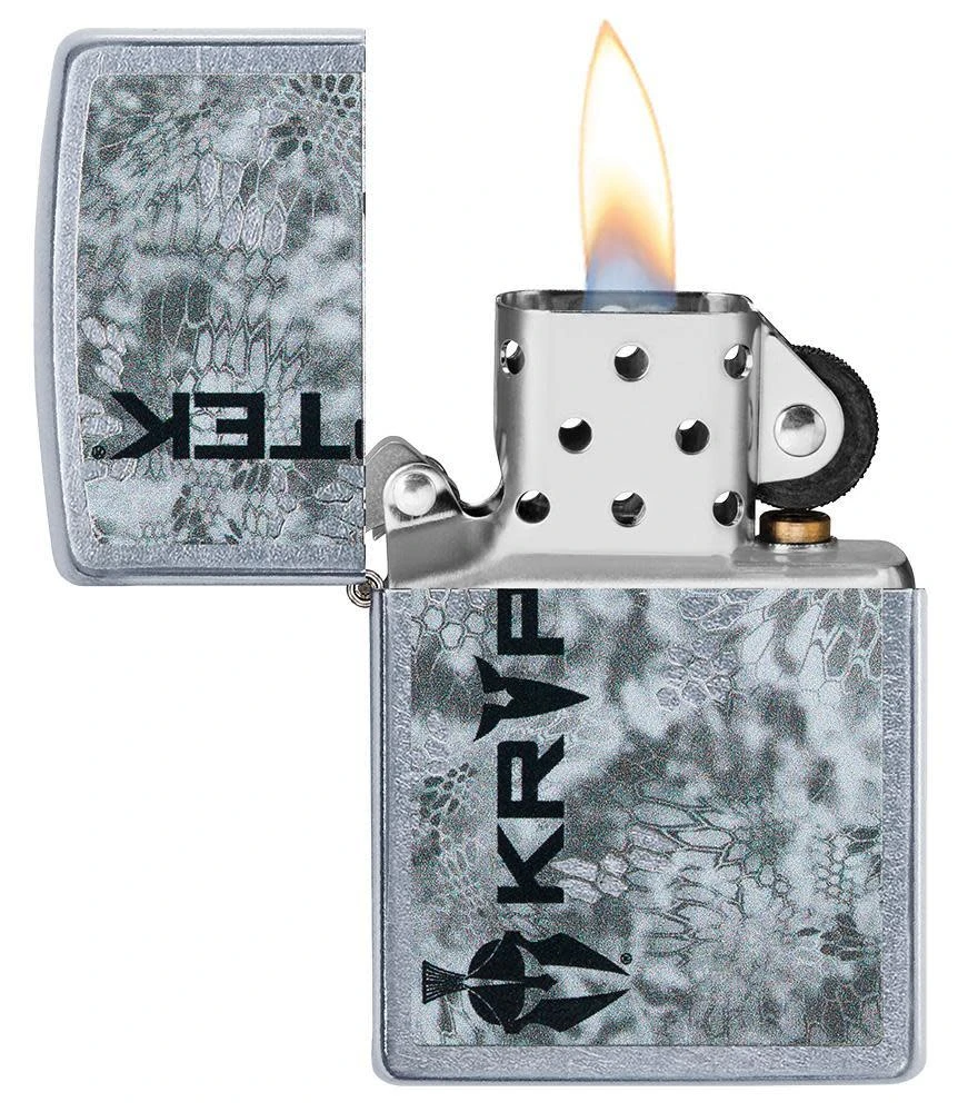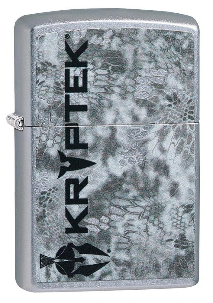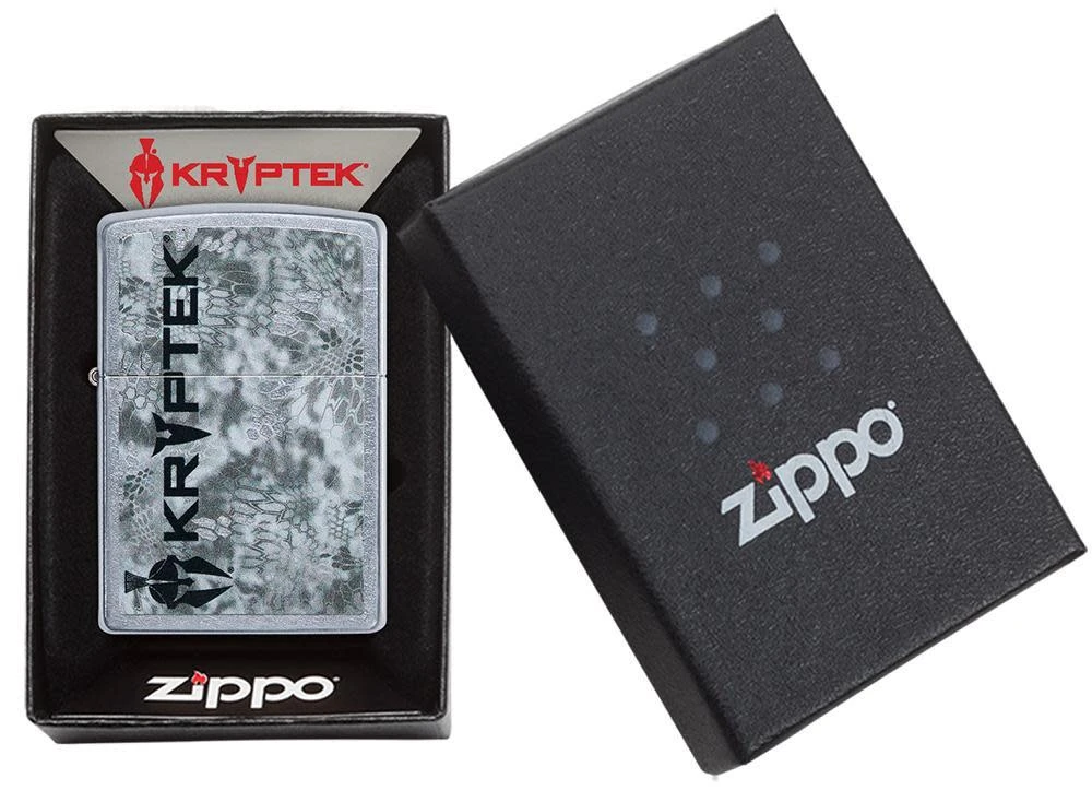 Introducing new designs featuring technologically advanced camouflage patterns from Kryptek®. This design displays the Kryptek® logo colour imaged against their signature grey Raid camo on a Street Chrome™ lighter. From the range to the woods, make sure you take your lighter with you. Comes packaged in Zippo’s premium box. For optimum performance, fill with Zippo lighter fuel.